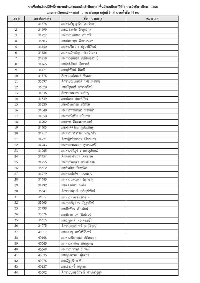 ประกาศผลสอบคัดเลือกเข้าศึกษาต่อระดับชั้นมัธยมศึกษาปีที่ 4 ปีการศึกษา 2568