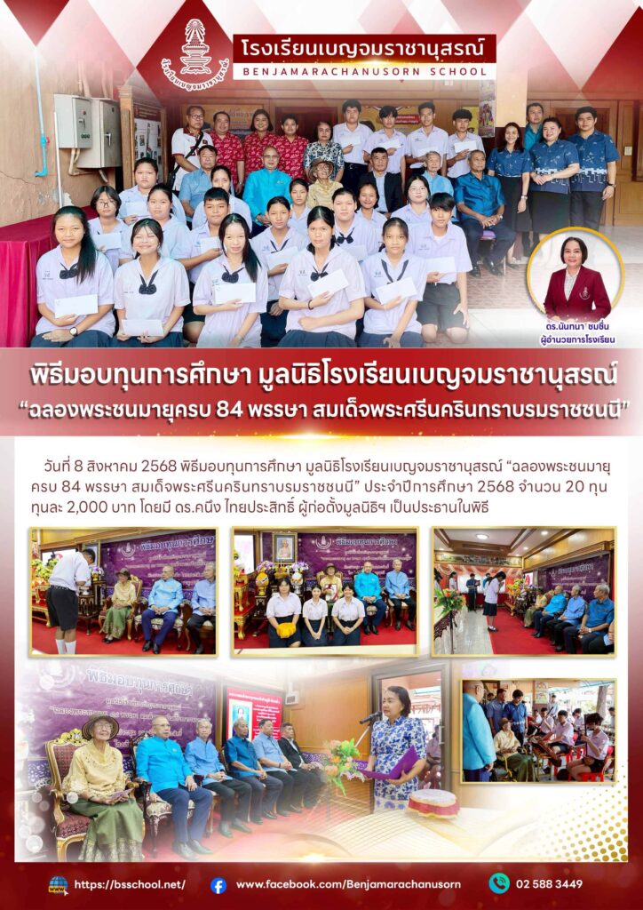 พิธีมอบทุนการศึกษา มูลนิธิโรงเรียนเบญจมราชานุสรณ์ “ฉลองพระชนมายุครบ 84 พรรษา สมเด็จพระศรีนครินทราบรมราชชนนี” 10 สิงหาคม 2025Phatnaree Phophanจดหมายข่าวประชาสัมพันธ์
