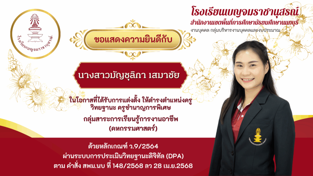 ขอแสดงความยินดีกับนางสาวมัญชุสิกา เสมาชัย ในโอกาสที่ได้รับการแต่งตั้ง ให้ดํารงตําแหน่งครู วิทยฐานะ ครูชำนาญการพิเศษ กลุ่มสาระการเรียนรู้การงานอาชีพ (คหกรรมศาสตร์) 25 พฤษภาคม 202524 มิถุนายน 2025Phatnaree Phophanจดหมายข่าวประชาสัมพันธ์