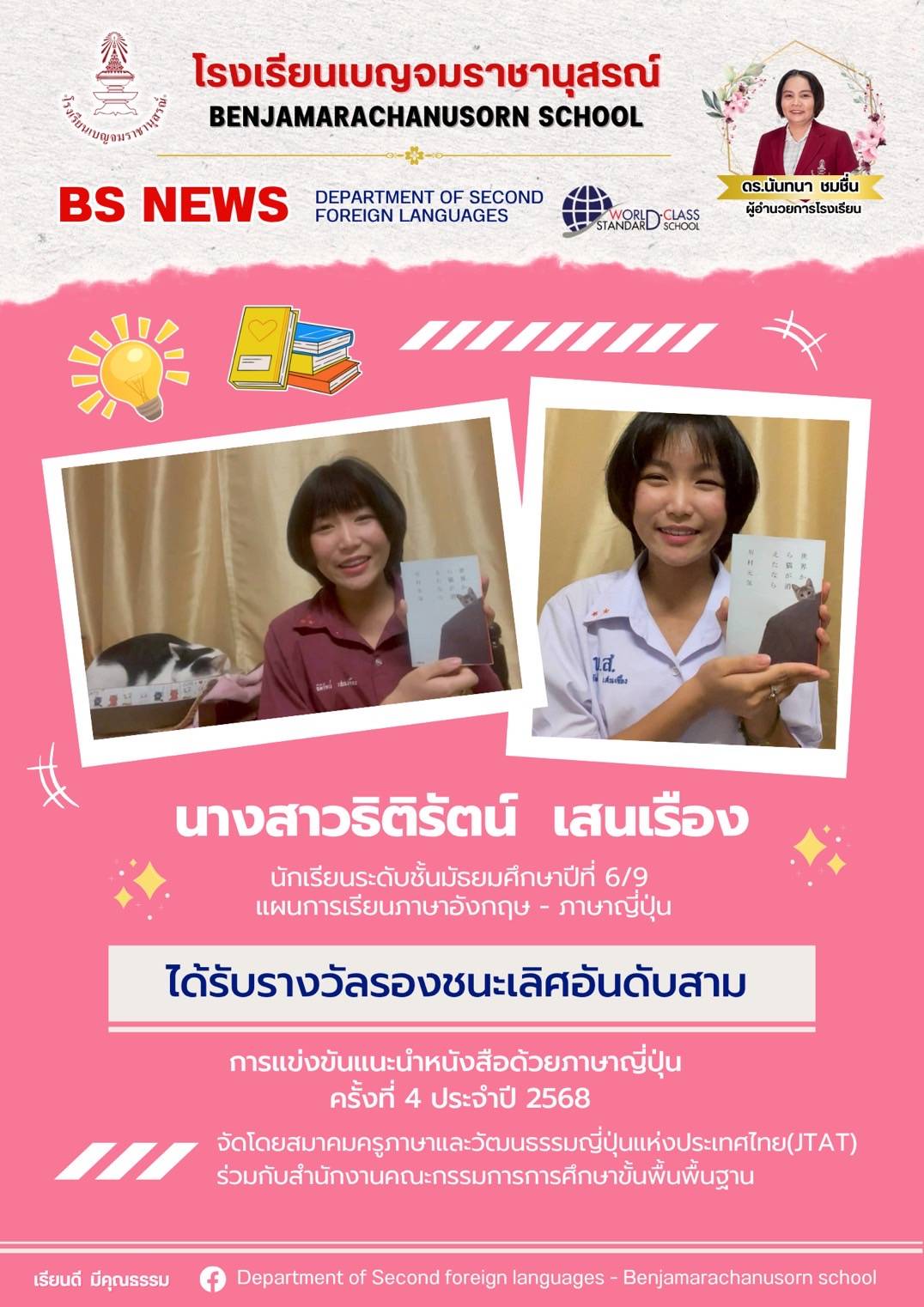 นางสาวธิติรัตน์ เสนเรือง นักเรียนระดับชั้นมัธยมศึกษาปีที่ 6/9 แผนการเรียนภาษาอังกฤษ – ภาษาญี่ปุ่น ได้รับรางวัลรองชนะเลิศอันดับสาม การแข่งขันแนะนำหนังสือด้วยภาษาญี่ปุ่น ครั้งที่ 4 ประจําปี 2568 จัดโดยสมาคมครูภาษาและวัฒนธรรมญี่ปุ่นแห่งประเทศไทย(TAT) ร่วมกับสํานักงานคณะกรรมการการศึกษาขั้นพื้นพื้นฐาน 13 ตุลาคม 202515 ตุลาคม 2025Phatnaree Phophanจดหมายข่าวประชาสัมพันธ์, ผลงานนักเรียน