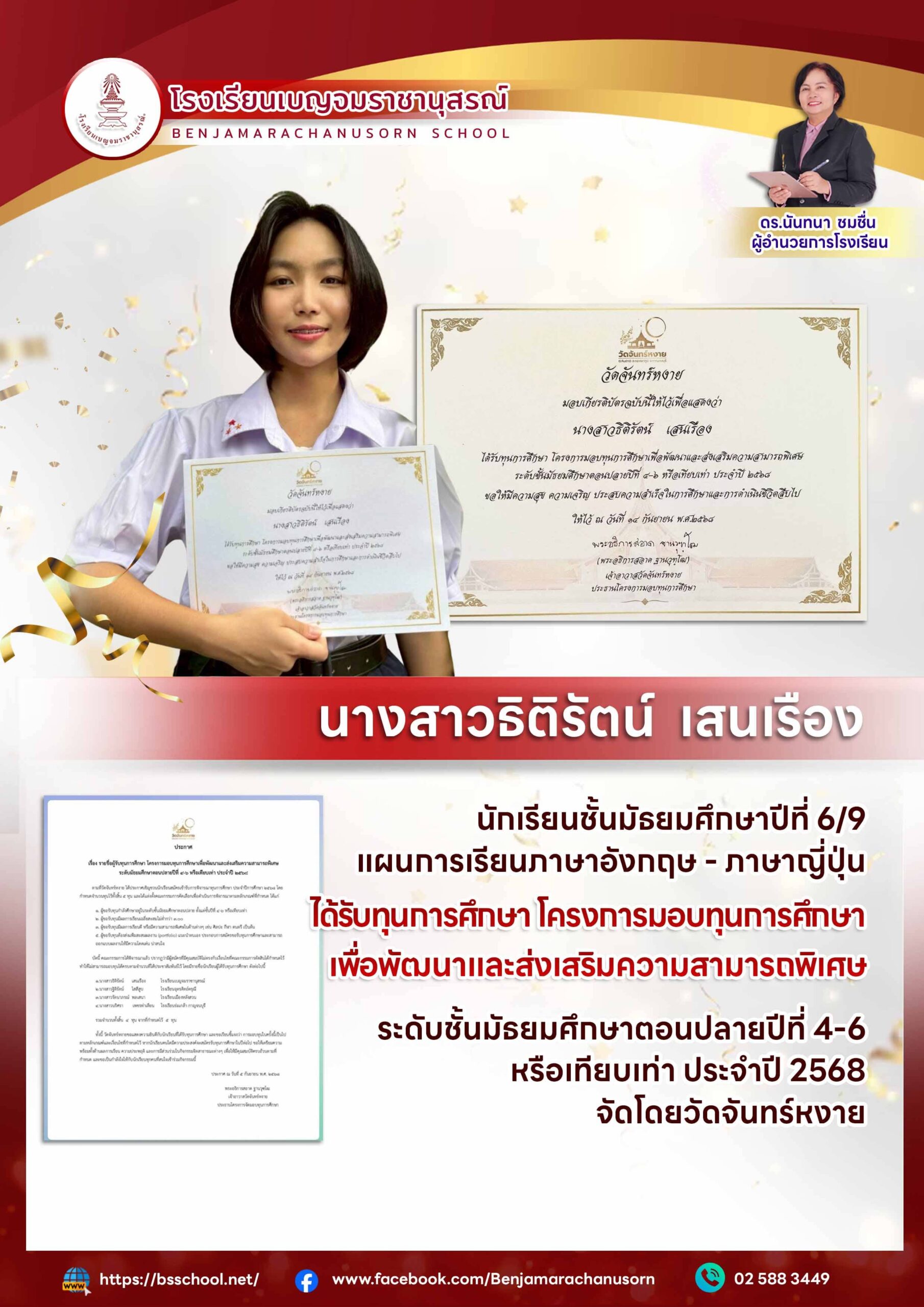 นางสาวธิติรัตน์ เสนเรือง ได้รับทุนการศึกษา โครงการมอบทุนการศึกษา เพื่อพัฒนาและส่งเสริมความสามารถพิเศษ 15 ตุลาคม 2025Phatnaree Phophanจดหมายข่าวประชาสัมพันธ์, ผลงานนักเรียน