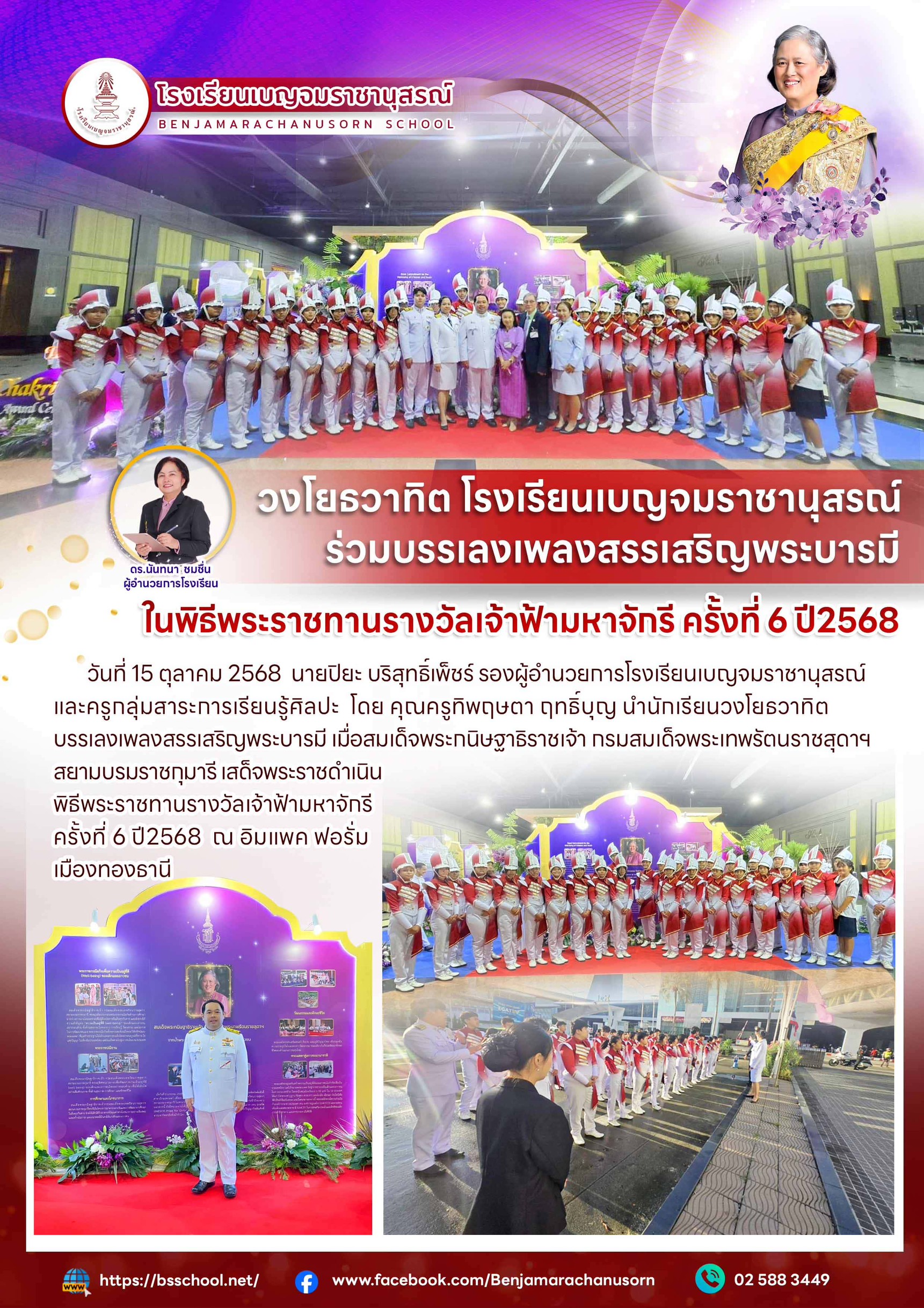 วงโยธวาทิต โรงเรียนเบญจมราชานุสรณ์ ร่วมบรรเลงเพลงสรรเสริญพระบารมี ดร.นันทนา ชมชื่น ผู้อำนวยการโรงเรียน ในพิธีพระราชทานรางวัลเจ้าฟ้ามหาจักรี ครั้งที่ 6 ปี2568 17 ตุลาคม 2025Phatnaree Phophanจดหมายข่าวประชาสัมพันธ์