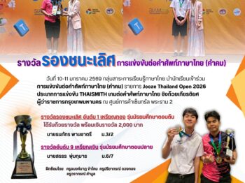 รางวัลรองชนะเลิศ การแข่งขันต่อคำศัพท์ภาษาไทย (คำคม) รายการ Jooze Thailand Open 2026 19 มกราคม 202619 มกราคม 2026Ketsarin Kirdsongจดหมายข่าวประชาสัมพันธ์